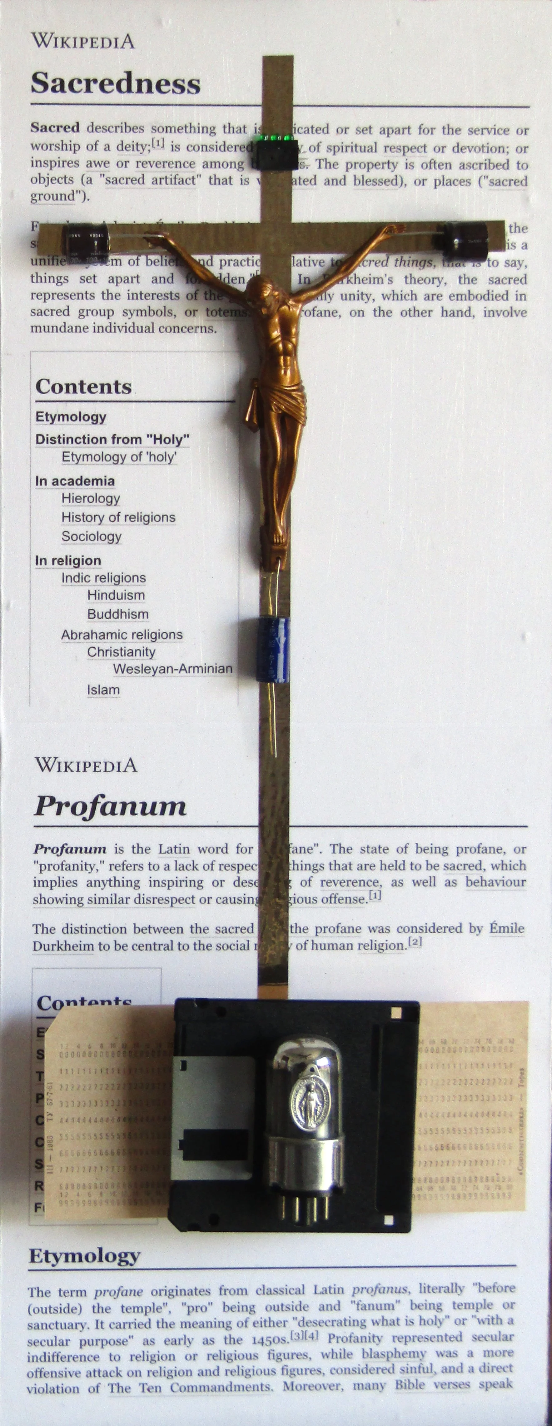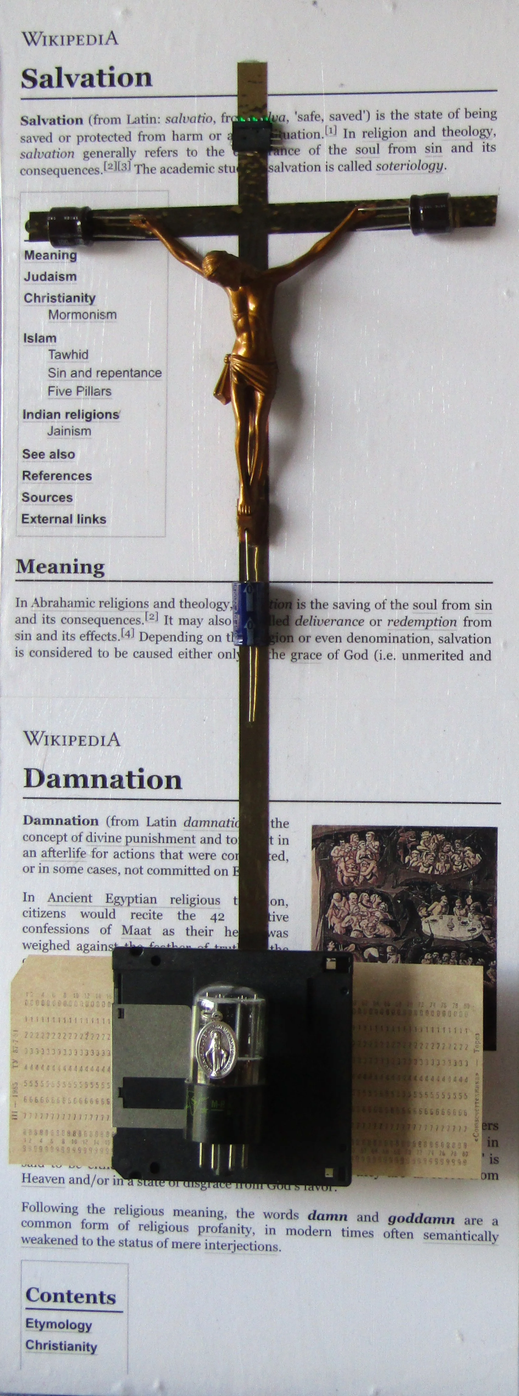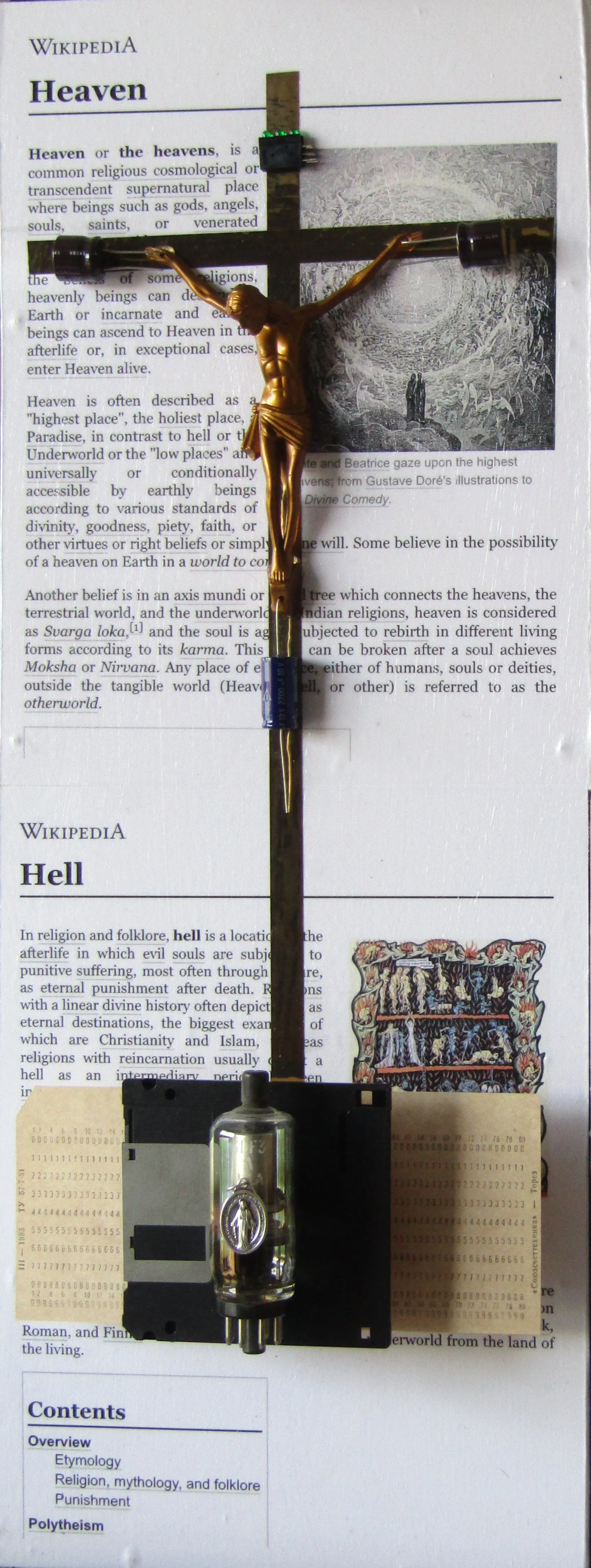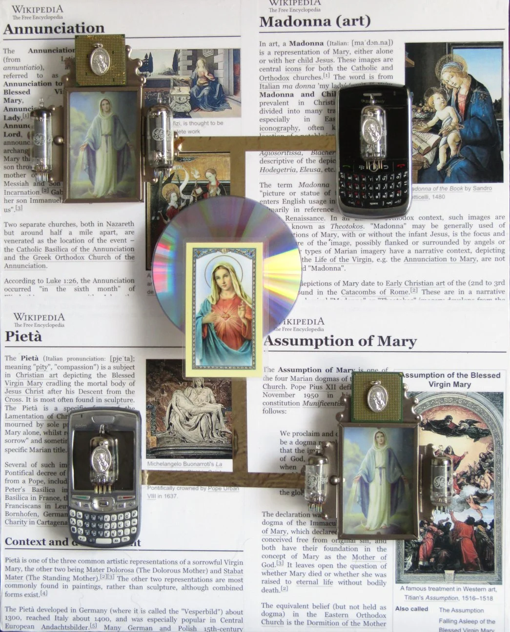 I use a background collage of printed Wikipedia articles that relate to the theme of the work. I add to that acrylic paint reminiscent of the Pop Art screen printing of the 1960s for a focal point of the work. Then, in a carefully conceived schematic, evocative of a circuit diagram I add gold tape and paint, vacuum tubes, computer punch cards, circuit boards, religious medals, crucifixes, and a variety of symbolic objects that relate to the specific subject of the individual artwork. In these artworks I view our emerging technocracy through a critical lens of philosophy and inequality.