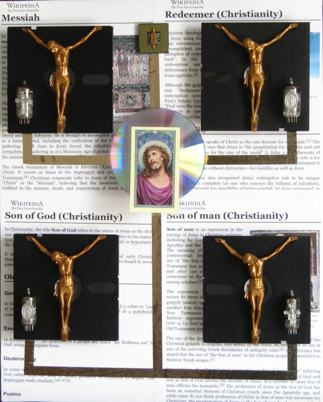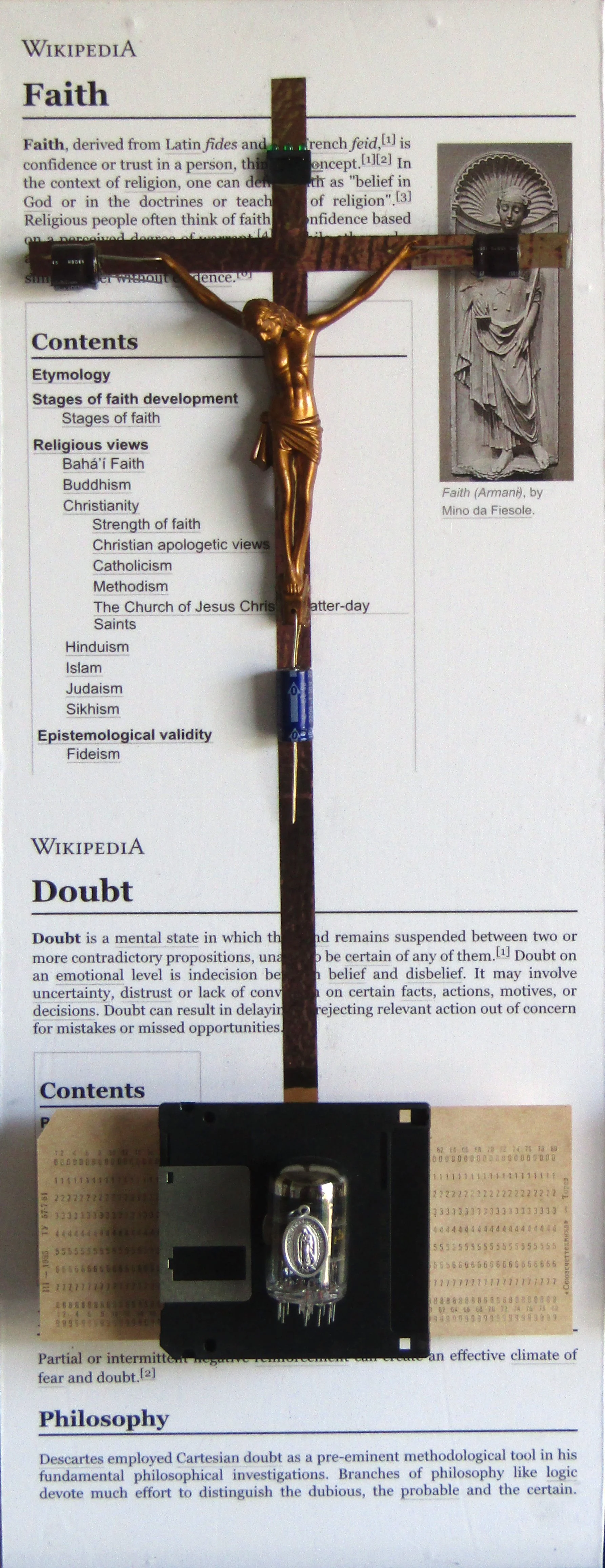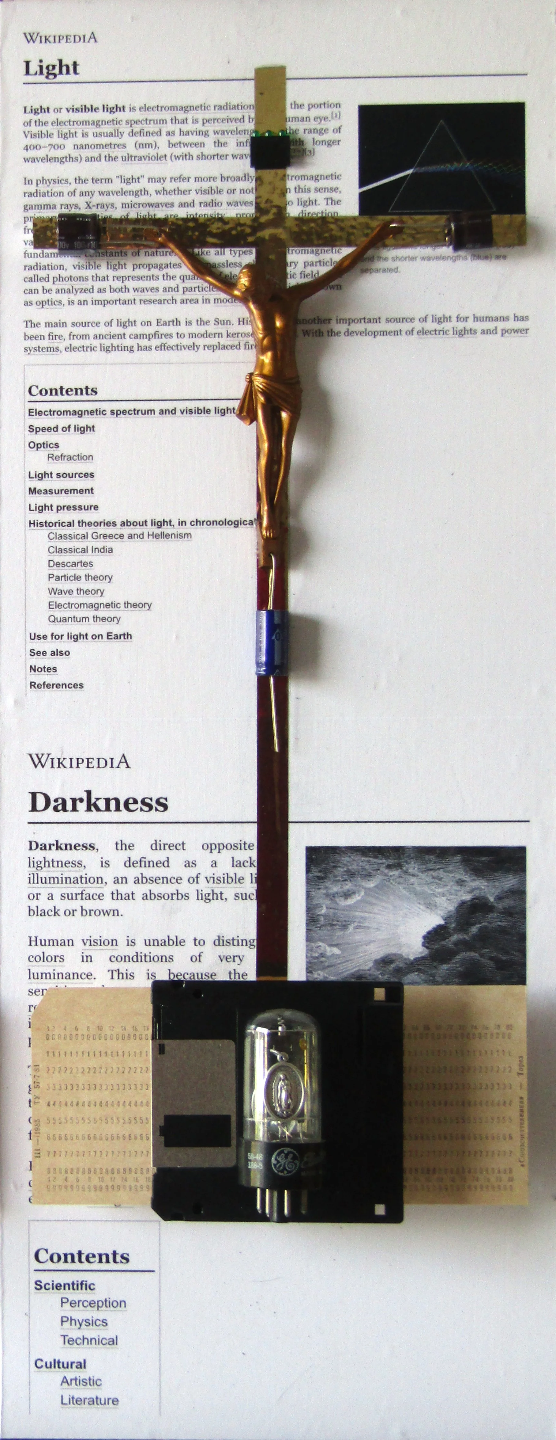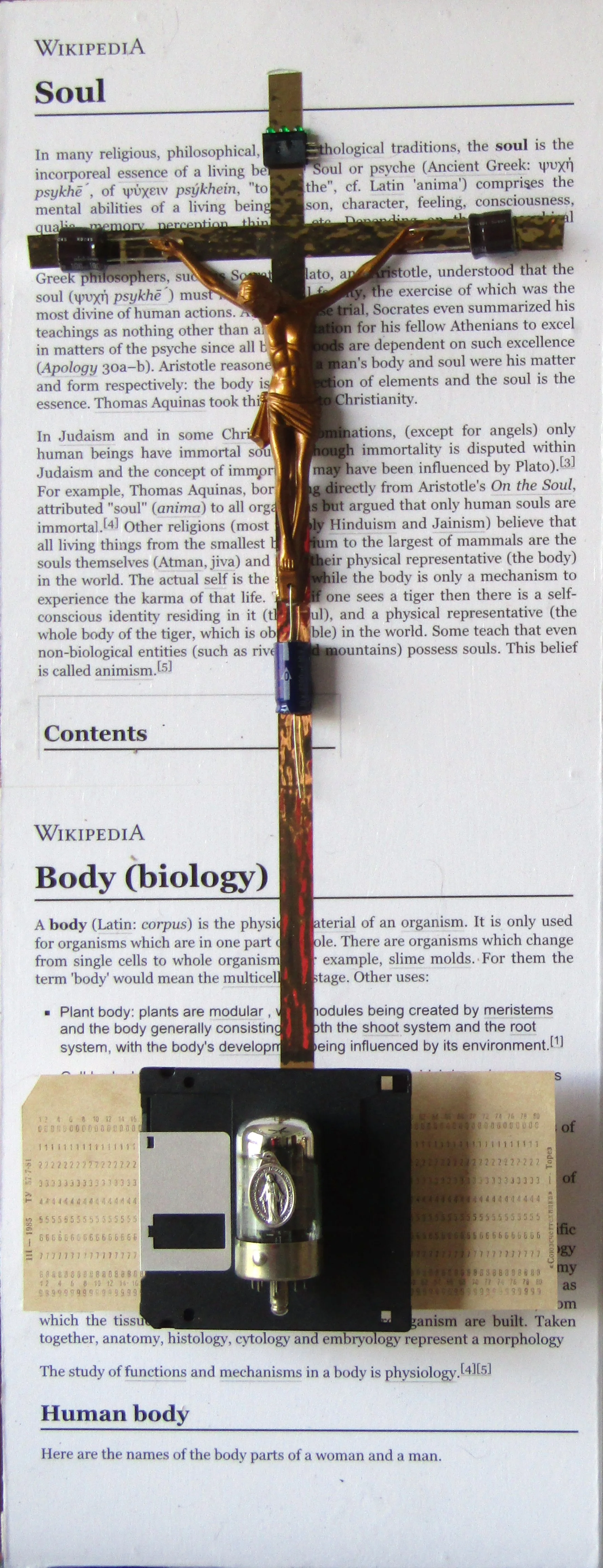 I use a background collage of printed Wikipedia articles that relate to the theme of the work. I add to that acrylic paint reminiscent of the Pop Art screen printing of the 1960s for a focal point of the work. Then, in a carefully conceived schematic, evocative of a circuit diagram I add gold tape and paint, vacuum tubes, computer punch cards, circuit boards, religious medals, crucifixes, and a variety of symbolic objects that relate to the specific subject of the individual artwork. In these artworks I view our emerging technocracy through a critical lens of philosophy and inequality.