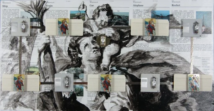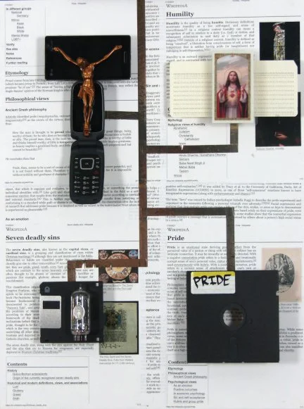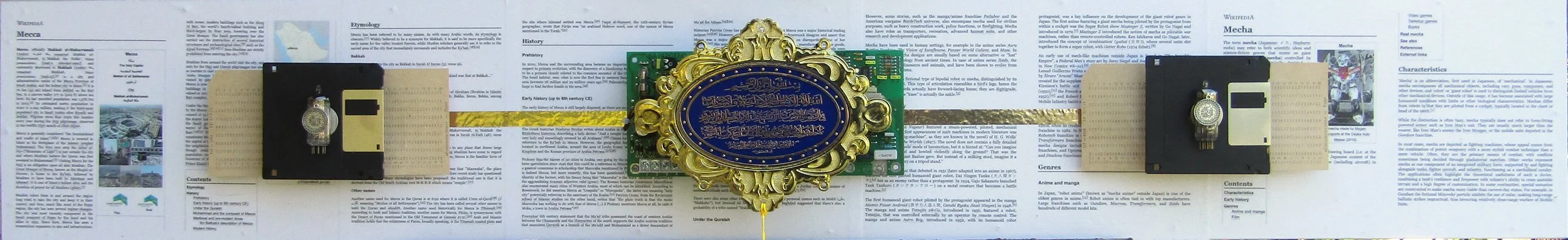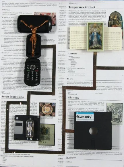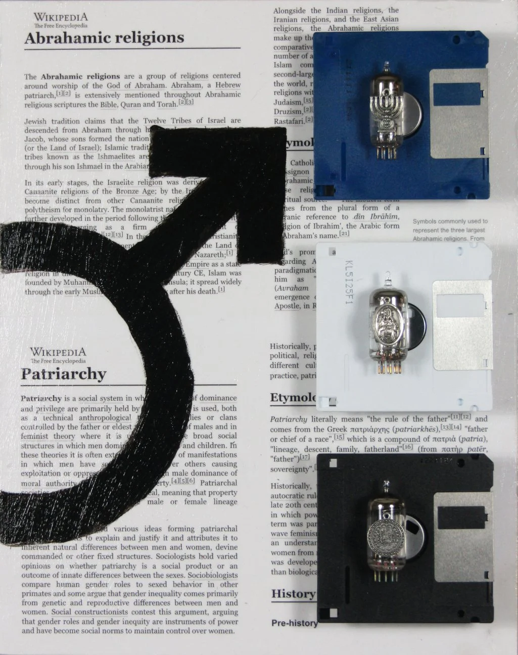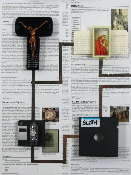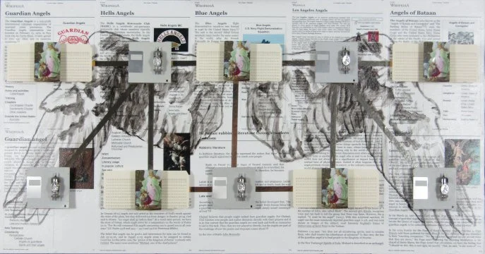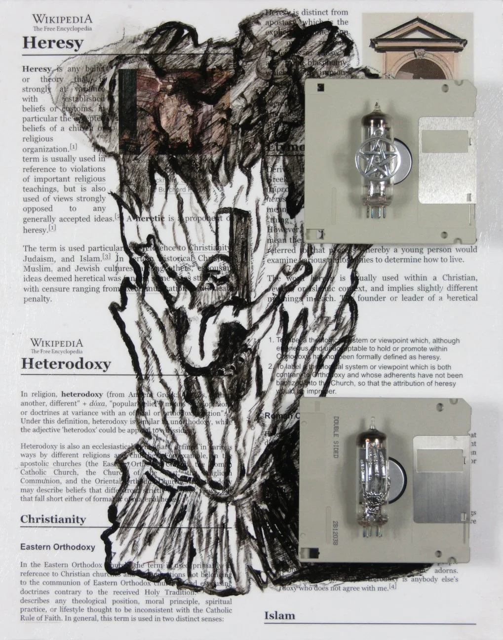 I use a background collage of printed Wikipedia articles that relate to the theme of the work. I add to that acrylic paint reminiscent of the Pop Art screen printing of the 1960s for a focal point of the work. Then, in a carefully conceived schematic, evocative of a circuit diagram I add gold tape and paint, vacuum tubes, computer punch cards, circuit boards, religious medals, crucifixes, and a variety of symbolic objects that relate to the specific subject of the individual artwork. In these artworks I view our emerging technocracy through a critical lens of philosophy and inequality.