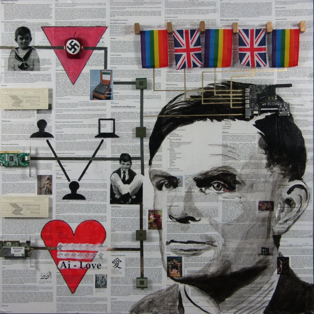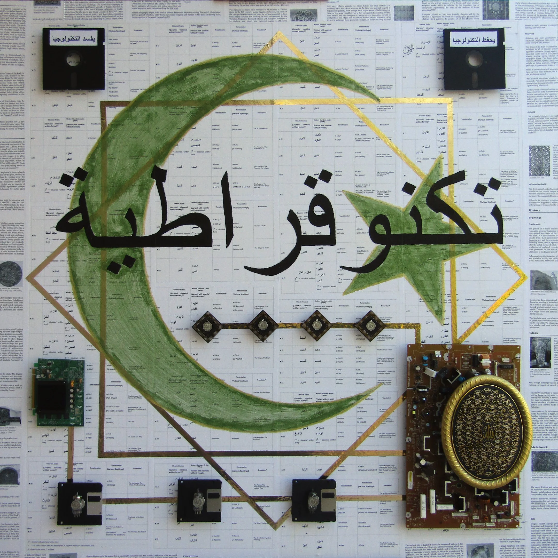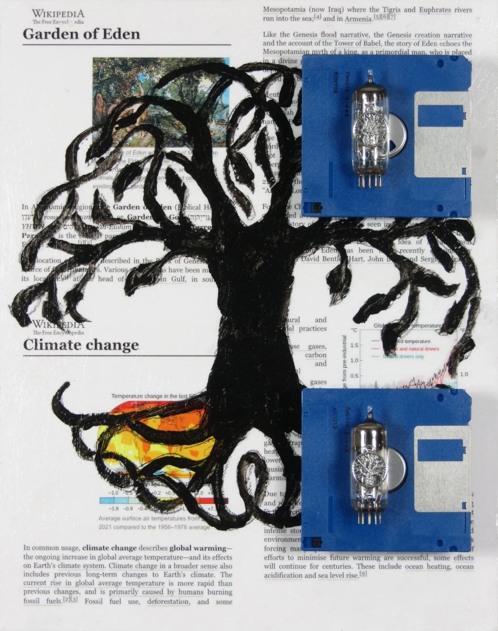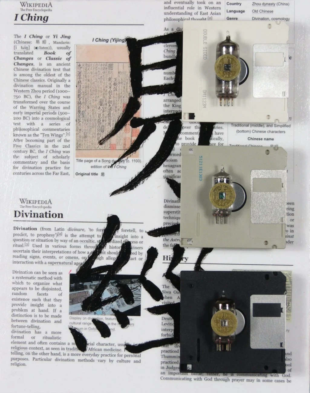 I use a background collage of printed Wikipedia articles that relate to the theme of the work. I add to that acrylic paint reminiscent of the Pop Art screen printing of the 1960s for a focal point of the work. Then, in a carefully conceived schematic, evocative of a circuit diagram I add gold tape and paint, vacuum tubes, computer punch cards, circuit boards, religious medals, crucifixes, and a variety of symbolic objects that relate to the specific subject of the individual artwork. In these artworks I view our emerging technocracy through a critical lens of philosophy and inequality.